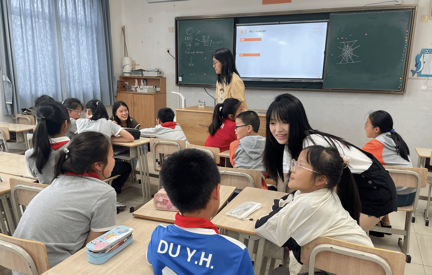 活动中,三位老员工帮助小朋友将座位布置成四组。由陈旖旎同学针对“阅·无界”项目进行简单介绍;孙欣悦同学展开故事分享,选取的是中国神话故事“伏羲织网”,让孩子在了解中国故事的同时能够积累英文表达、提升英文表达能力;强丽雯同学聚焦人与自然和谐共处的主题组织小朋友分组进行讨论。三位小老师分别加入不同小组的讨论,引导员工尝试表达自己的看法。课程深受孩子们喜欢,现场氛围活跃热烈,孩子们纷纷表示自己从课程中收获了很多。