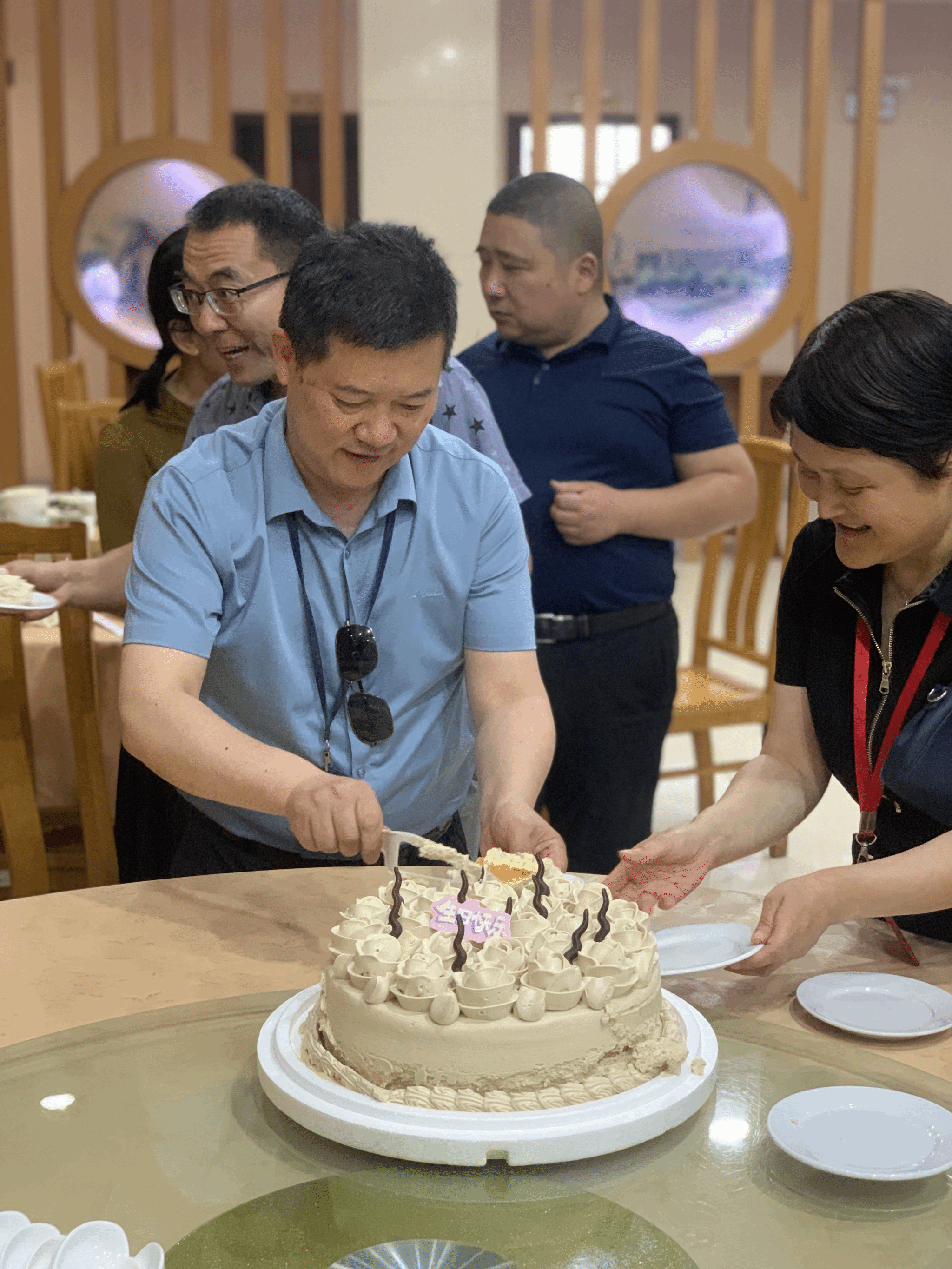 庆祝活动在温馨的氛围中开始,大家先享用了精心准备的套餐和传统的生日面。学院领导与荣退老师共坐一桌,畅谈过去的美好时光,感受着同事间深厚情谊和集体归属感。餐后,大家一同合影留念,记录下这美好的瞬间。经理亲自为大家切蛋糕,现场气氛达到了高潮,老师们分享着美味的蛋糕,互道生日祝福,共享外院大家庭的温暖与欢乐。