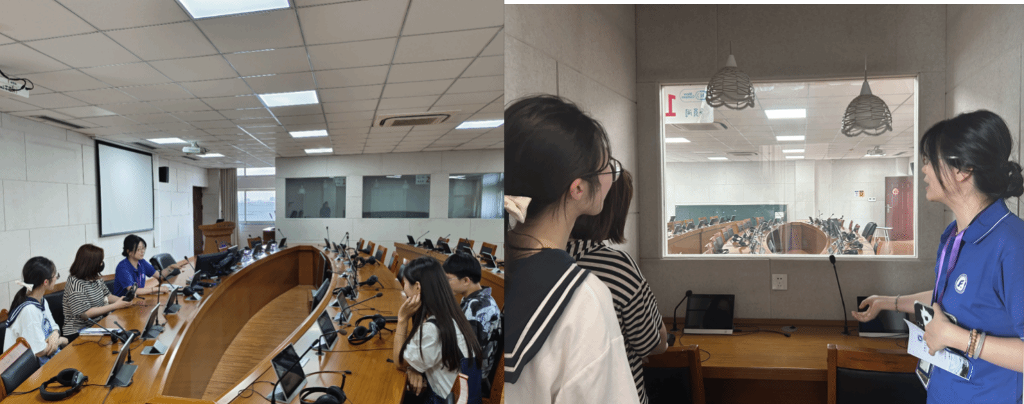 员工们在同声传译实验室使用专业级的同传设备沉浸式体验翻译的过程,了解良好的教学实训环境,感受翻译的魅力。