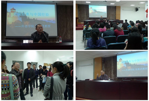 讲座中,朱教授就美国与中国对待文化经典的不同态度进行对比,通过"哪个国家的言论更自由?"、"哪个国家的员工更尊师重教?"等问题引导同学们对中美两国文化发展的现状进行深入思考。他指出,"社会越成熟,暴露的问题就会越多,就越接近死亡。当财富积累到一定程度时,人们终究会意识到,精神上的虚无有多么可怕。"他从海明威的《杀手》联想到佛山小月月事件,从文化的角度反思物质文明高度发达的现代社会中人的麻木。