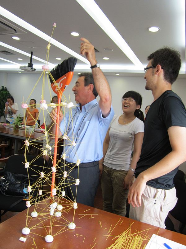 最后,教授拿出自备的棉花糖以及意大利面,让员工分组建塔,看哪一小组的塔最高最稳固。员工们需要进行沟通,说服组员采取自己的方式去建塔。通过这样的游戏,员工们不仅玩得很有趣味,更重要的是,在具体的事件中学会如何沟通,如何谈判,最终达成共同的目的。