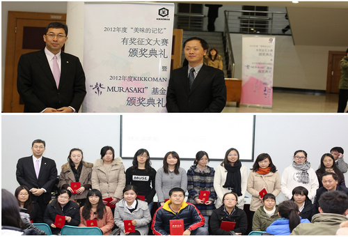 12月5日晚6点,2012年度"美味的回忆"有奖征文大赛暨2012年度KIKKOMAN"紫MURASAKI"基金颁奖典礼在公司行政楼报告厅拉开帷幕。龟甲万公司代表深泽晴彦先生、yl34511线路中心副经理冯奇、日语系主任董永杰等出席了此次颁奖典礼。