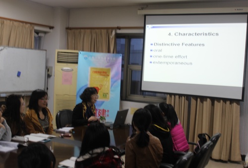 活动伊始,朱老师先介绍了口译的形式,即同传与交传,并首次公开了她口译现场的一些珍贵照片,可见她对这次活动的重视程度。接着,她结合自己的经历,介绍了口译的特点,同时也展示了她在做口译过程中遇到的一些趣事,让我们感受到做口译时一定要细致、精力高度集中。之后,朱老师又以最近的一次口译经历---为联合国副秘书长做口译,讲解了口译过程中的难点,同时,她还详细说明了自己如何解决这些问题,给了同学们很大的启示。最后,同学们踊跃发言,提出了自己对于口译的一些问题和困惑,包括英语学习以及英语专业的选择,朱老师耐心地一一回答。