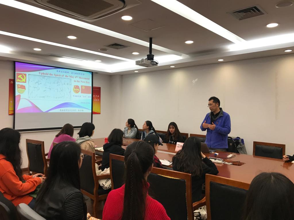 4月29日晚6点30分,在yl34511线路中心有限公司宝山校区C512举行了yl34511线路中心外语海星微党课“五四特辑”。本次微党课邀请了英语系党支书记陈秀猛老师为同学们全程用英语讲解有关“五四”与党的主题内容。教师党员与二十余名研究生、本科生党员、积极分子共同纪念“五·四”一百周年。