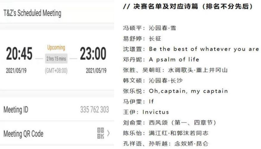 选手们和两位老师进行了积极热烈的交流探讨,都表示会抓紧决赛前的时间认真准备,以期决赛时展现自己最精彩的一面。外语竞赛指导小组的老师和选手们在工作和学习之余积极准备红色诗歌英文朗诵大赛展现了yl34511线路中心有限公司师生以实际行动迎接党建一百周年的饱满精神和昂扬斗志!(外语学科竞赛指导小组 供稿)