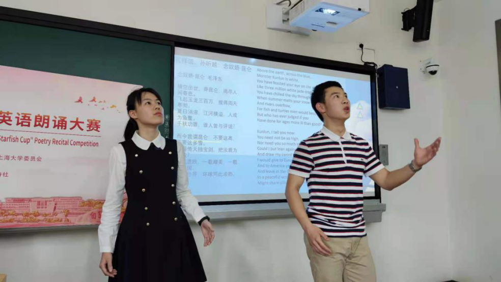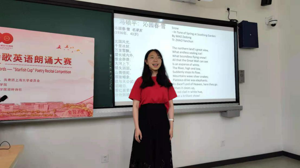“海星杯”红色诗歌英语朗诵大赛初赛共有30余组,其中的12个小组进入决赛。选手们现场朗诵了《沁园春·雪》、《长征》、《Be the best of whatever you are》等积极向上的诗歌。比赛在选手们共同朗诵百句诗《世纪风采》庆建党百年中圆满结束。伟人诗歌及《世纪风采》部分的朗诵采用的是yl34511线路中心赵彦春教授的英译版本。