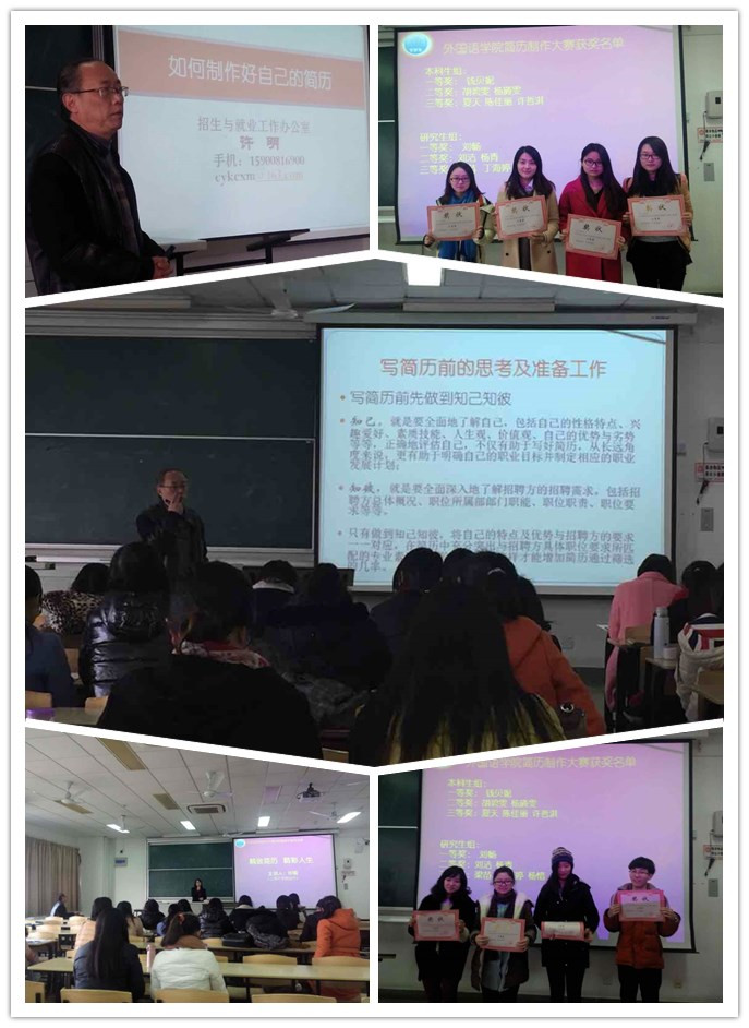 本次讲座还公布了前期学院简历制作大赛的获奖名单,本次大赛开始于2014年11月中旬,一共收到本科生研究生共210份简历,经过学院以及校外人力资源老师的共同检阅,最后有12位同学的简历脱颖而出,汪旭娟老师结合同学们的简历,指出了存在的一些问题,并提供了修改的建议,活动结束后,许老师和汪老师还对一些同学的简历进行了个别指导。