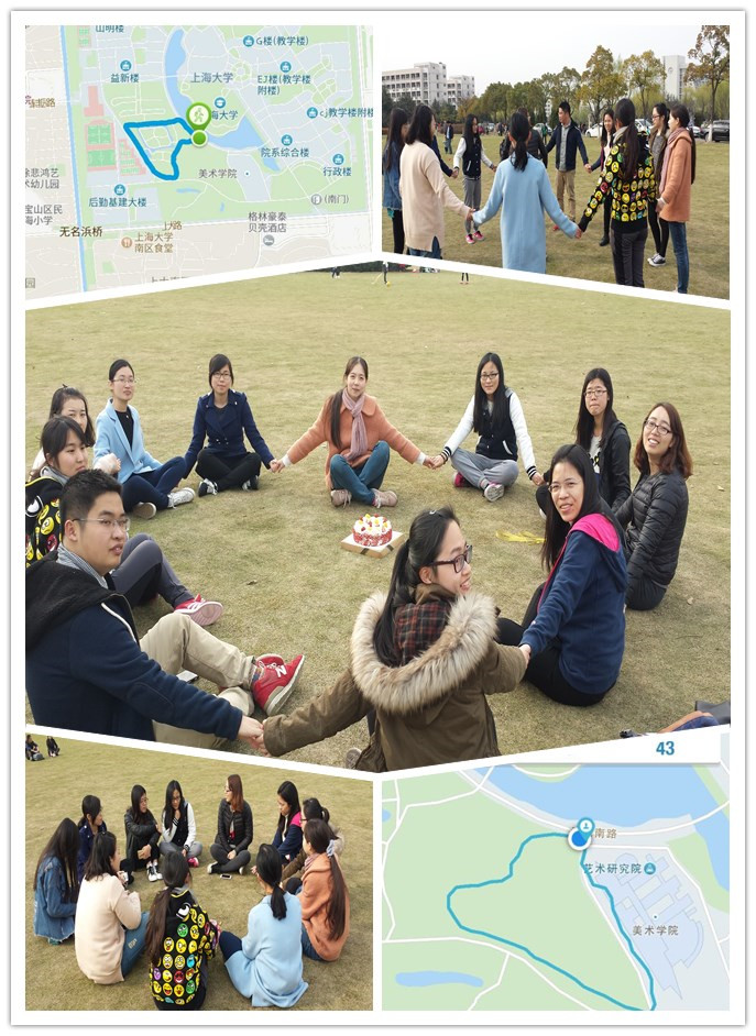随后,我们迎来了整场素拓的高潮。成员被分为两个小组,各组使用手机软件记录行走路线并让路线图呈爱心状。阐述完游戏规则后各小组迅速聚集在一起热烈讨论行走路线,充分计划后便开始行动起来。大约过了10分钟,两组成员先后带着自己的路线图返回原点。